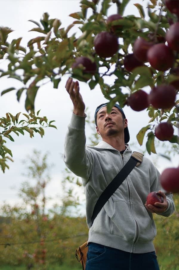 宮城県大郷町でりんご農園を営む上杉一乃歩さんは上杉りんご園の三代目。三十年以上前に祖父が始めたりんご園を七年前から継いでいます。土壌には当初、近隣の牛舎の肥やしを使用していたそうで、現在でも化学肥料は一切使わず、堆肥を使って丁寧に土作りをしながらりんごを育てています。